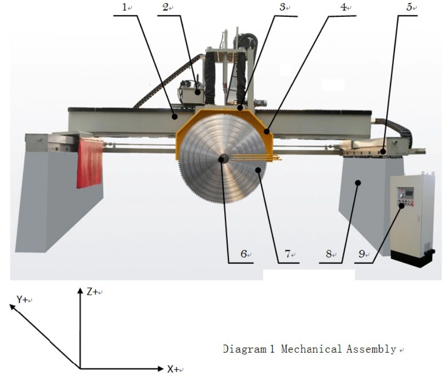 1,横梁组件2、液压站3、挡板组件4、水盖组件5、纵梁组件6、主轴箱组件7、叶片8、基础组件9、控制面板。